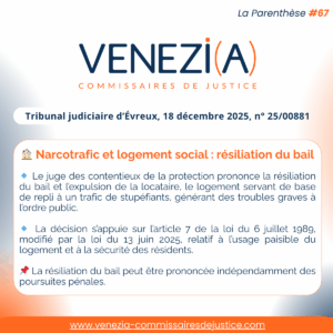 Par un jugement du 18 décembre 2025, le Tribunal judiciaire d’Évreux prononce la résiliation d’un bail d’habitation et l’expulsion de la locataire, le logement ayant servi de base de repli à un trafic de stupéfiants, générant des troubles graves à l’ordre public.